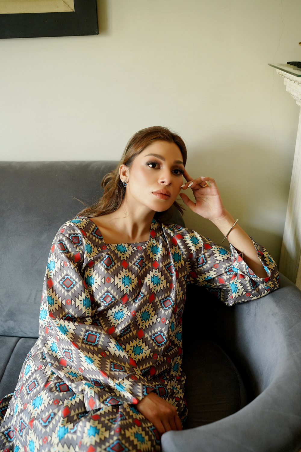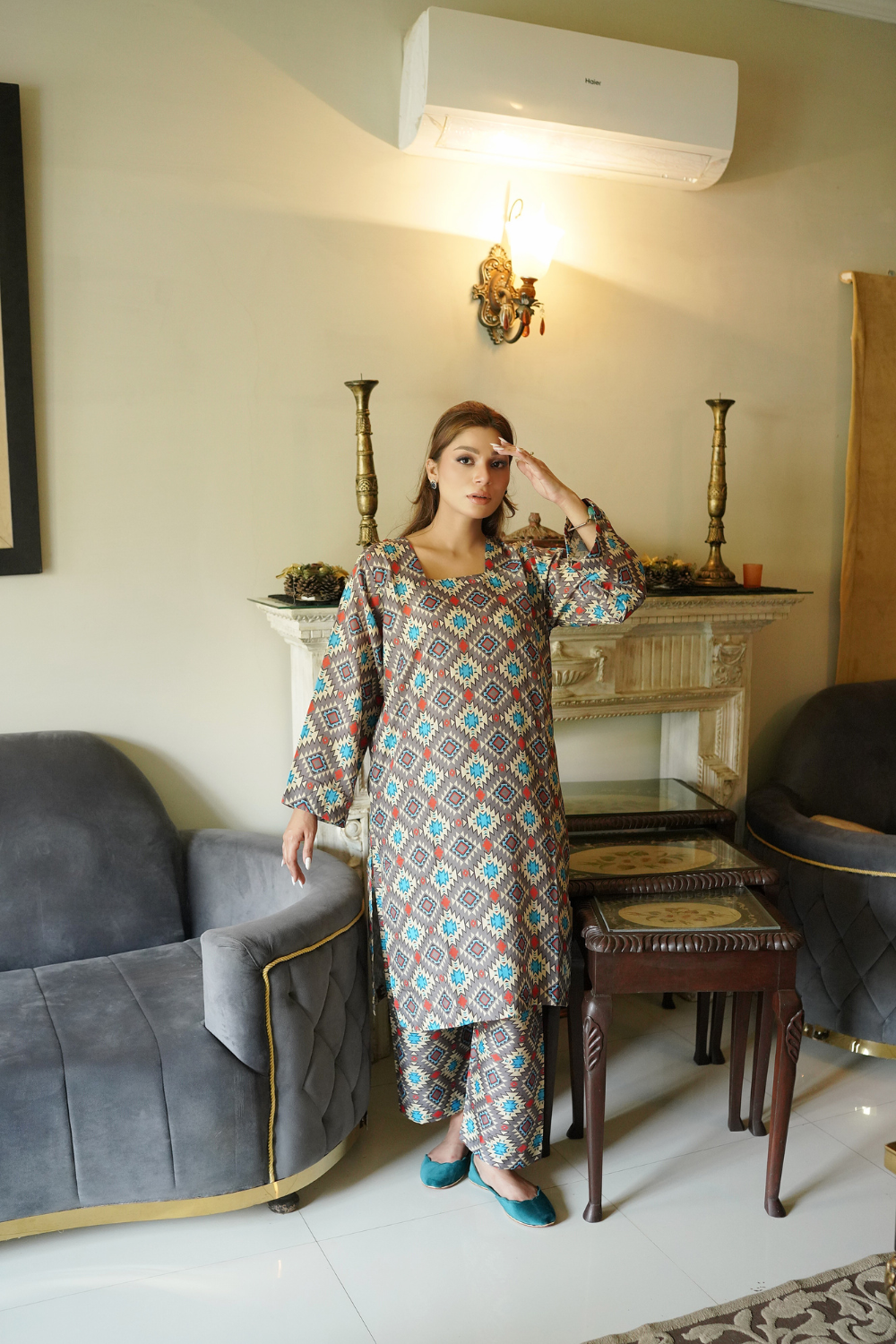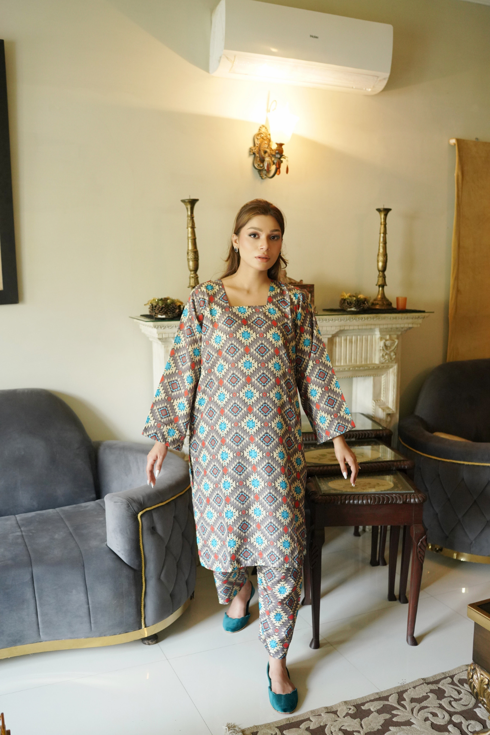 Experience comfort and sophistication with our Mirage two-piece suit, crafted from premium Poly Lawn fabric. This ensemble features a digitally printed design inspired by intricate geometric patterns, offering a vibrant yet elegant look. The loose-fit kurta with a square neckline and wide sleeves ensures a graceful silhouette, paired perfectly with matching trousers for a seamless, stylish appearance.